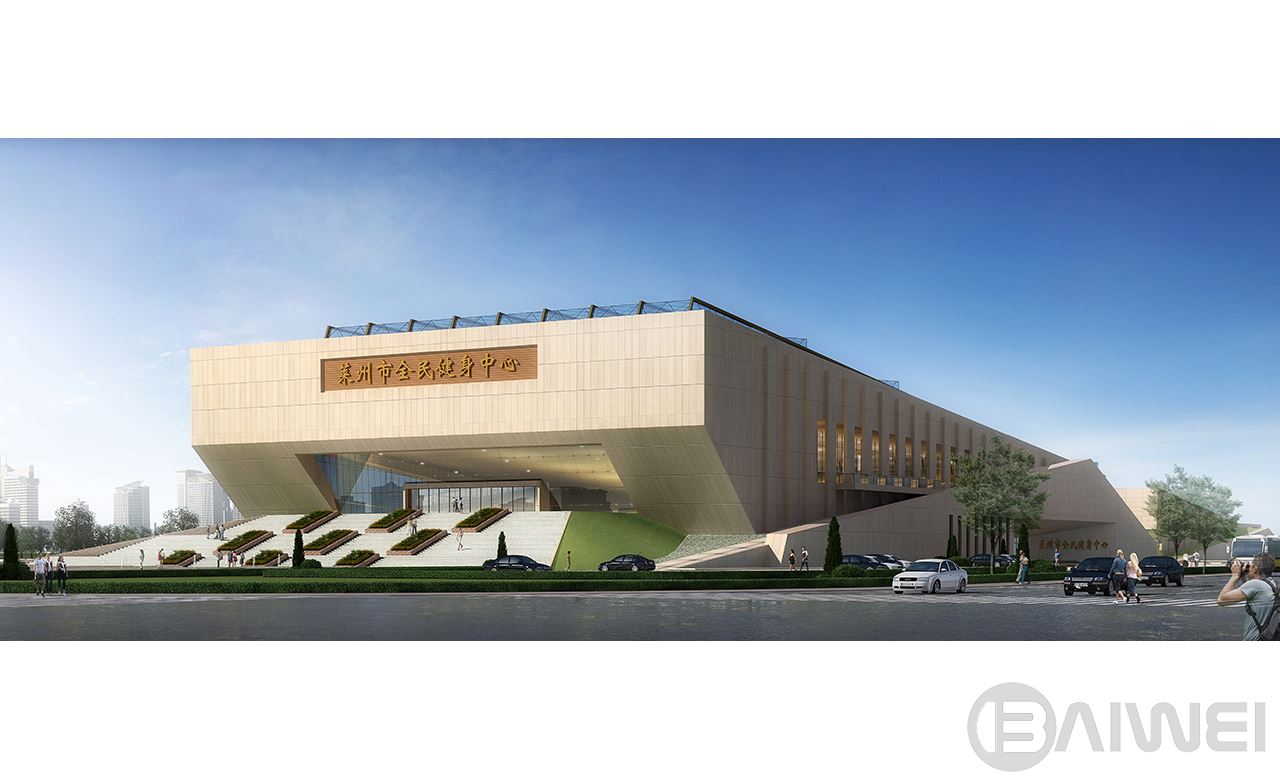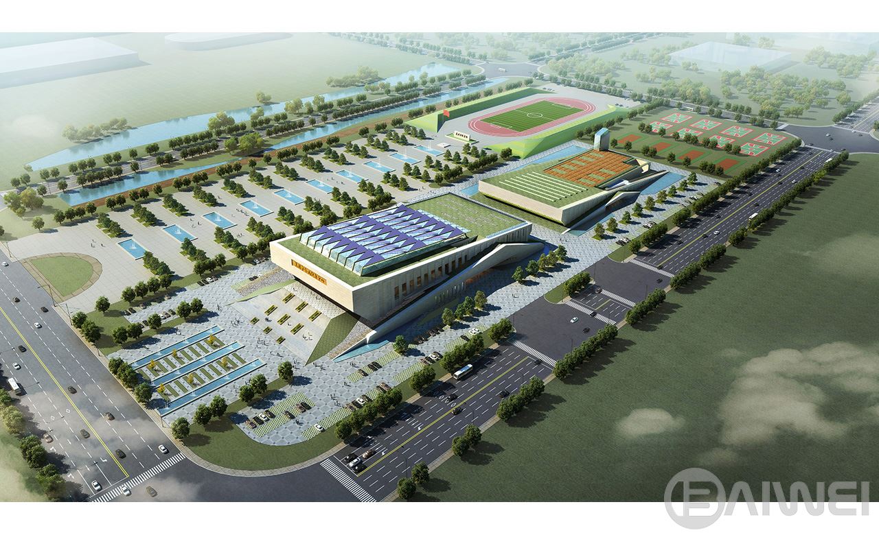 “靈石合出,福澤東萊”。本方案以:“靈石合出接祥瑞,全民健身福東萊”為設(shè)計(jì)主題,以彰顯萊州特色的山石文化。通過交匯而出的兩個(gè)石塊形成建筑基本體量,輔以流暢的線條和當(dāng)?shù)靥禺a(chǎn)的石材,打造出渾然天成又極具萊州特色的全民健身場(chǎng)所。建筑順應(yīng)地形,采用南北向矩形布局。同時(shí)根據(jù)用地周邊道路情況分別在場(chǎng)地南側(cè)的北苑路設(shè)置禮儀性人行主入口;東側(cè)的東嶺路設(shè)置機(jī)動(dòng)車出入口 ??紤]到體育場(chǎng)館使用上的特點(diǎn),地面停車的方式更為方便,停車場(chǎng)沿場(chǎng)館周邊分散式布置。平面功能以主體育館為中心,周邊配以輔助空間,其中觀眾、賽事組織、運(yùn)動(dòng)員、貴賓、辦公人員等均有其單獨(dú)的入口,以達(dá)到分區(qū)明確,流線清晰,互補(bǔ)干擾的設(shè)計(jì)目的。同時(shí)訓(xùn)練館與主體育館之間設(shè)置采光中庭,不但作為空間過度,豐富了內(nèi)部空間同時(shí)還解決了大進(jìn)深帶來的采光問題。