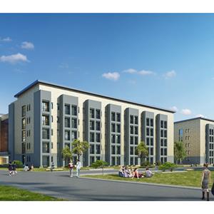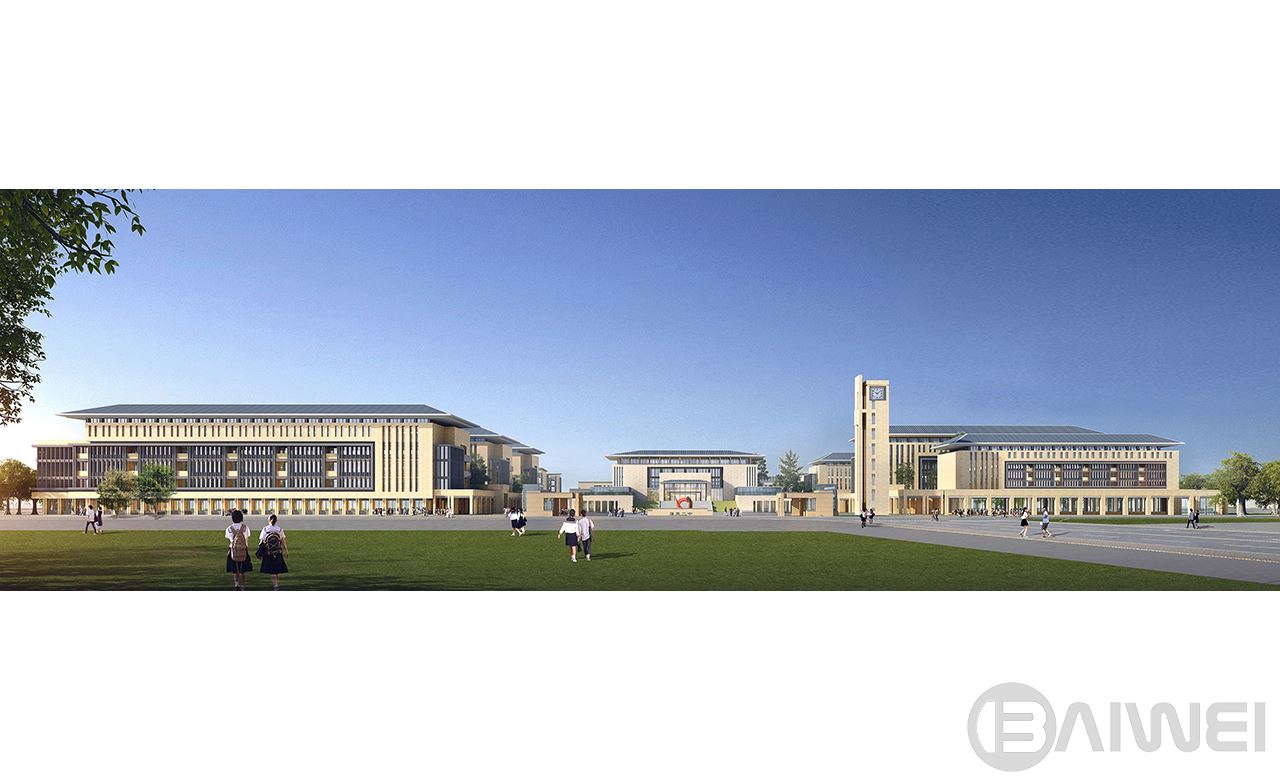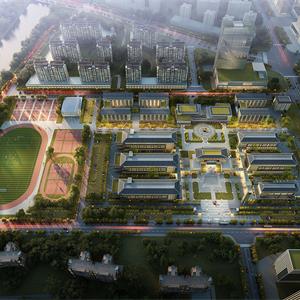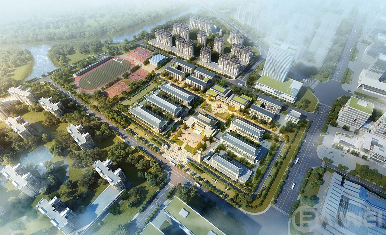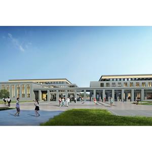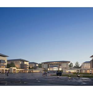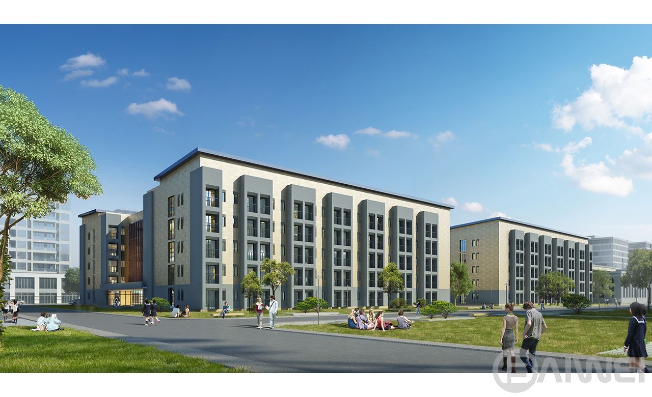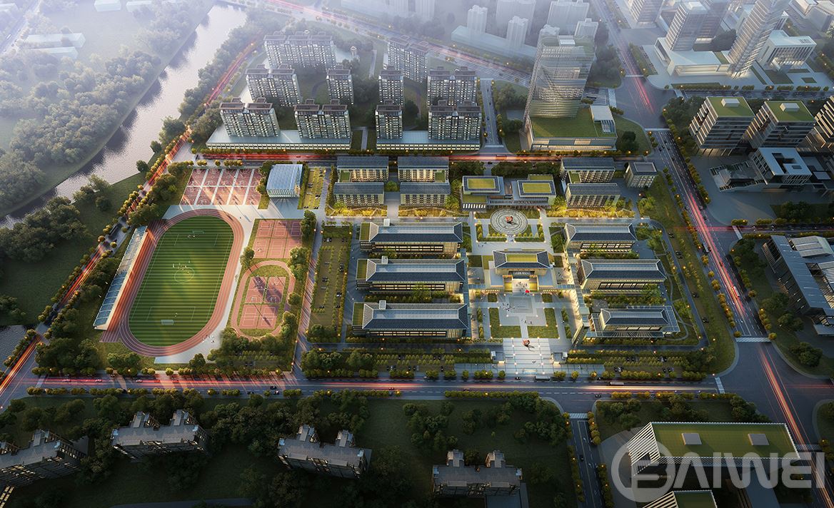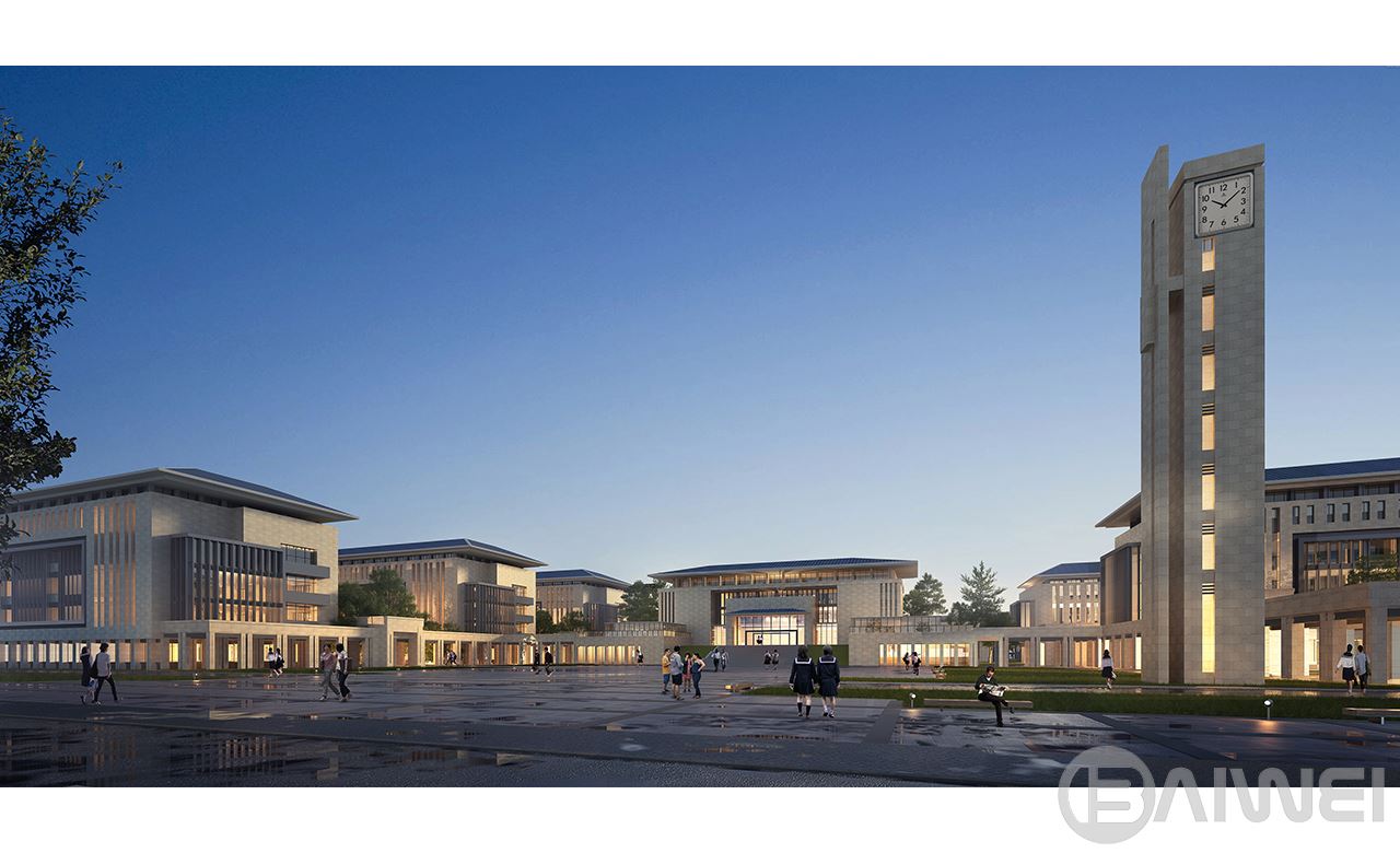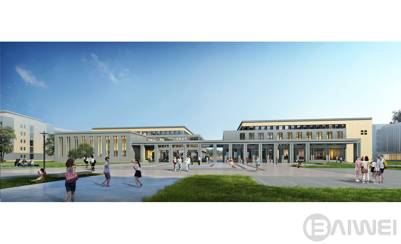 設(shè)計結(jié)合對外使用要求將藝術(shù)體育場館設(shè)置在校前區(qū)。教學(xué)區(qū)、運動區(qū)和生活區(qū)則以品字形結(jié)構(gòu)布置,便于三種活動的聯(lián)系。核心教學(xué)區(qū)形成集約化教學(xué)空間,符合緊湊的用地情況,布局流暢,氣勢磅礴,長達(dá)數(shù)百米的教學(xué)樓連廊空間,具有強烈的空間序列感和導(dǎo)向性。圖書館位于核心教學(xué)區(qū)南側(cè),是校園中軸的重要節(jié)點,整體造型莊重、典雅,形體曲直有致,與主樓、學(xué)院樓圍合成中央教學(xué)樓群核心。圖書館的位置位于“拉丁十字雙軸”的焦點上,對整個建筑全局起著統(tǒng)帥的作用。學(xué)生生活區(qū)結(jié)合東北特色,形成具有生活氣息的院落式空間。
