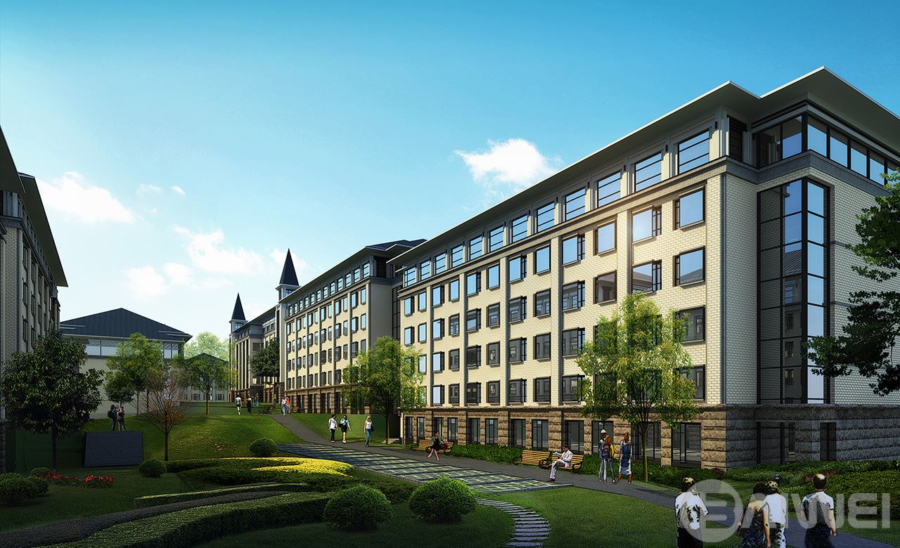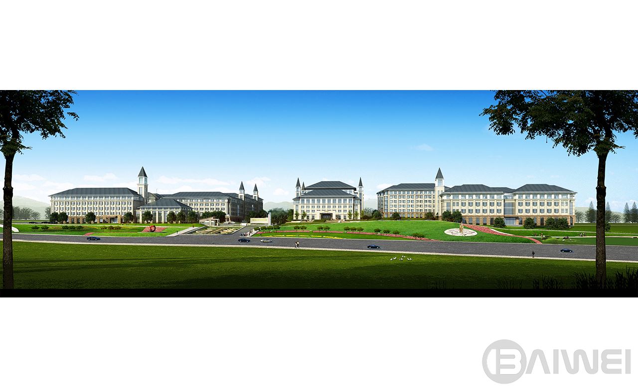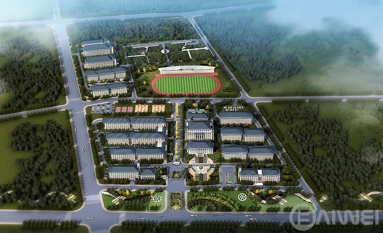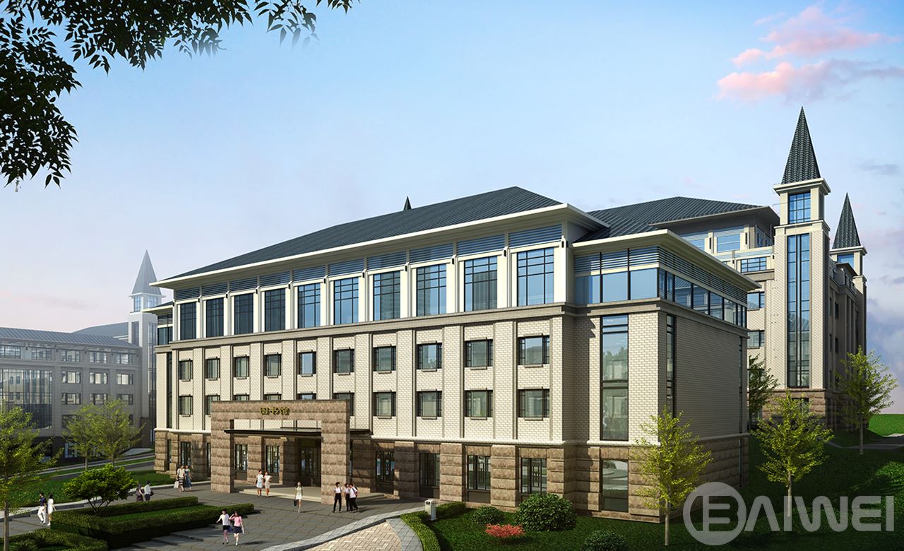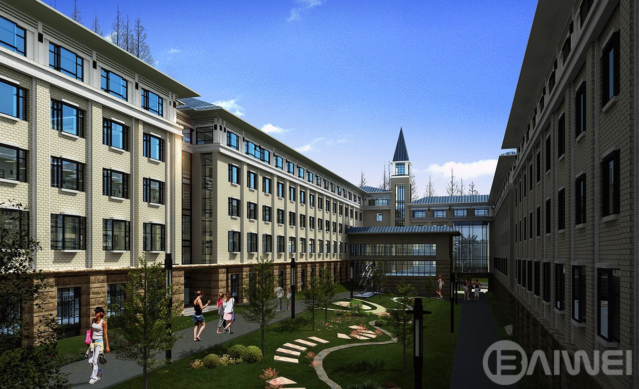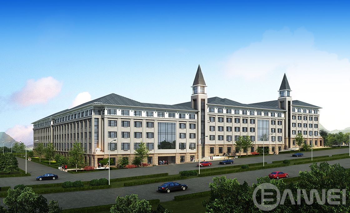 建筑依山勢展開,以共享向獨享漸變、喧鬧向安靜過渡為原則組織校園的功能布局結(jié)構(gòu)。建筑順山應(yīng)勢,形成錯落有致的屋頂輪廓;地勢高差變換的地方形成公共空間,以塔的形式將錯落的建筑單體聯(lián)系在一起,自然而然成為統(tǒng)一中的變化,豐富了立面造型空間感覺,起到畫龍點睛的作用。整個群體包括教學(xué)樓、宿舍樓、行政辦公、食堂、圖書館、實訓(xùn)樓、教工公寓等使用功能不同的建筑,在坡屋頂,三段式的立面組織形式,以及紅、灰、黑、白的色調(diào)搭配下,與周圍山地環(huán)境相互輝映滲透,描繪了一幅協(xié)調(diào)完整、含蓄內(nèi)斂的水墨風(fēng)情畫。