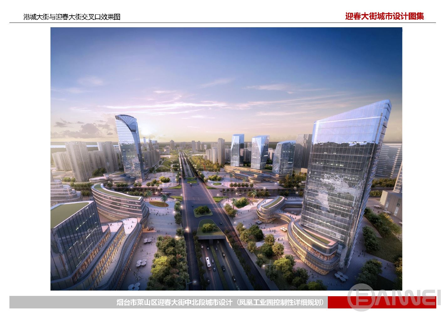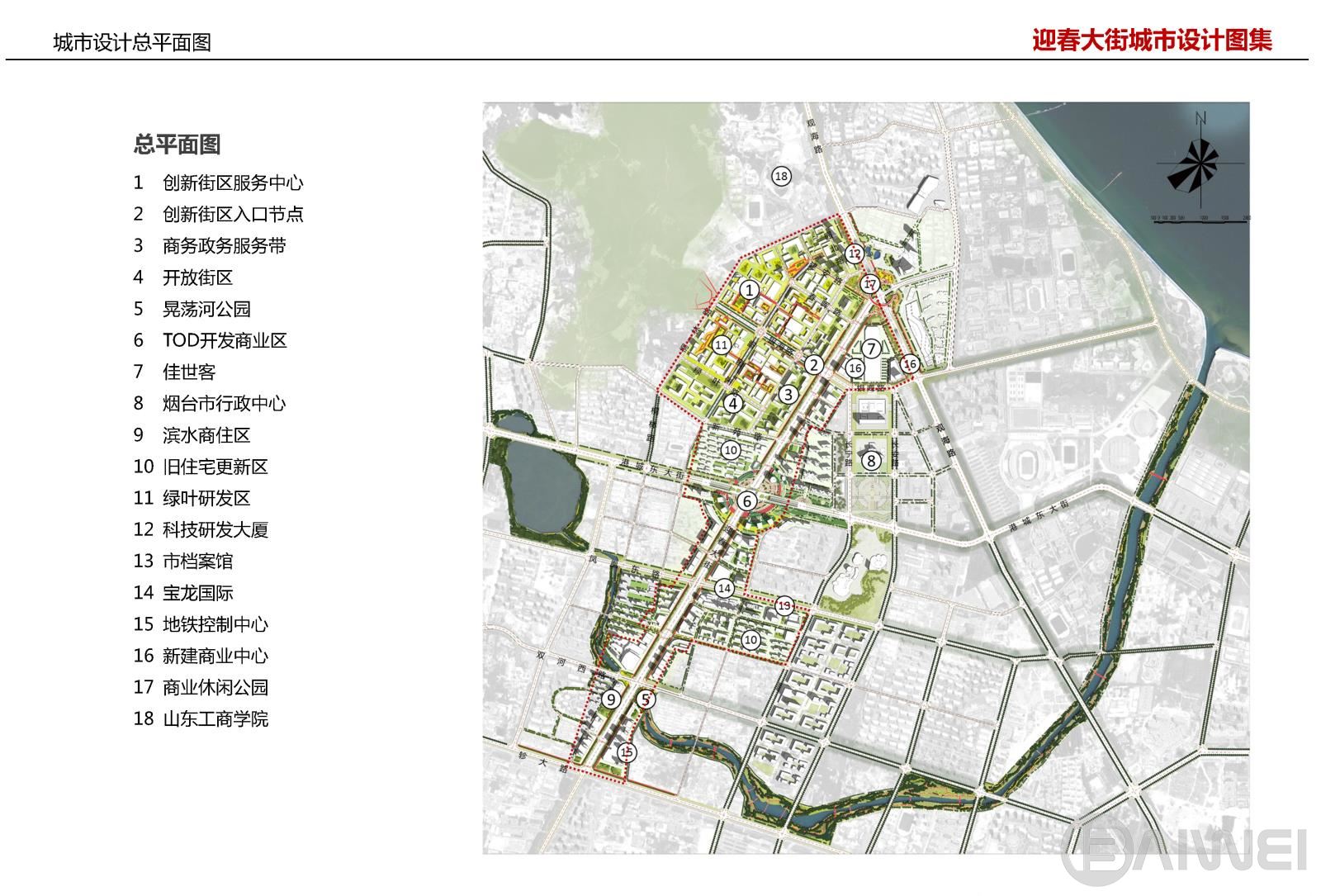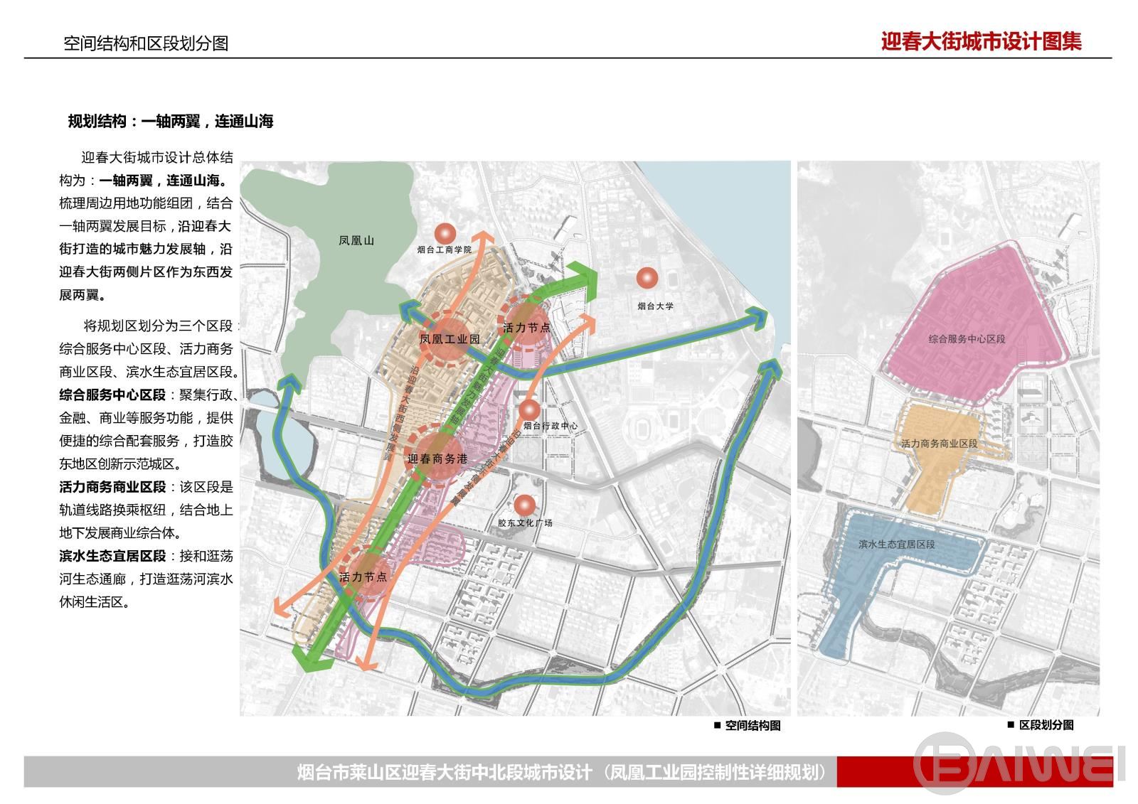迎春大街位于煙臺(tái)市萊山區(qū)北部城區(qū)中心地段,北起觀海路,南至軫大路,全長(zhǎng)約3.5公里。本次范圍約2.5平方公里,其中鳳凰工業(yè)園約1.1平方公里。本項(xiàng)目為突出迎春大街作為萊山區(qū)主要商業(yè)商務(wù)發(fā)展軸線所承載的功能和地位,推進(jìn)山東省新舊動(dòng)能轉(zhuǎn)換,加快鳳凰工業(yè)園區(qū)改造提升,從街道交通整治、形象提升、生態(tài)修補(bǔ)三個(gè)方面出發(fā),分別提出相應(yīng)的設(shè)計(jì)策略,對(duì)迎春大街(鳳凰工業(yè)園)風(fēng)貌進(jìn)行改造提升。形成“一軸兩翼、聯(lián)通山?!钡囊?guī)劃結(jié)構(gòu),劃分綜合服務(wù)中心區(qū)、活力商務(wù)商業(yè)區(qū)、濱水生態(tài)宜居區(qū)三個(gè)區(qū)段。并針對(duì)每個(gè)區(qū)段土地利用規(guī)劃、建筑高度和開發(fā)強(qiáng)度等提出控制要求。
