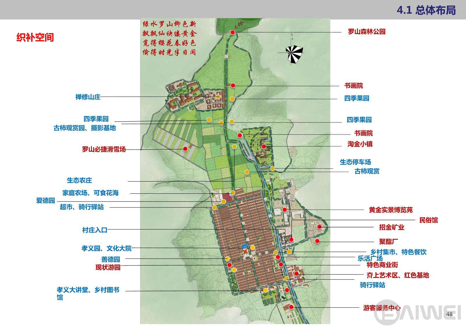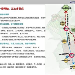規(guī)劃充分挖掘“生態(tài)、歷史文化”資源,以“黃金文化”為特色,大力發(fā)展現(xiàn)代農(nóng)業(yè)、休閑度假、康體養(yǎng)生、文化體驗(yàn)等功能。打造宜居宜業(yè)宜游示范村,綠意新韻黃金特色文化村,羅山旅游服務(wù)基地。